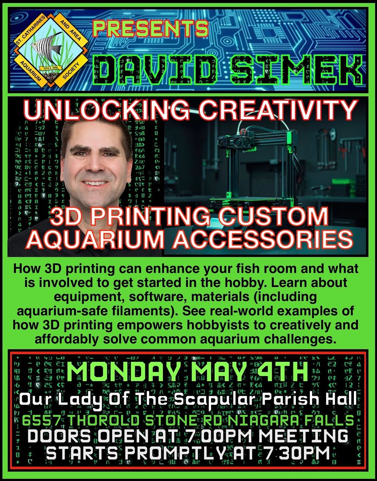 The St. Catharines And Area Aquarium Society will be hosting Dave Simek with his presentation involving 3-D printers in the aquarium hobby.